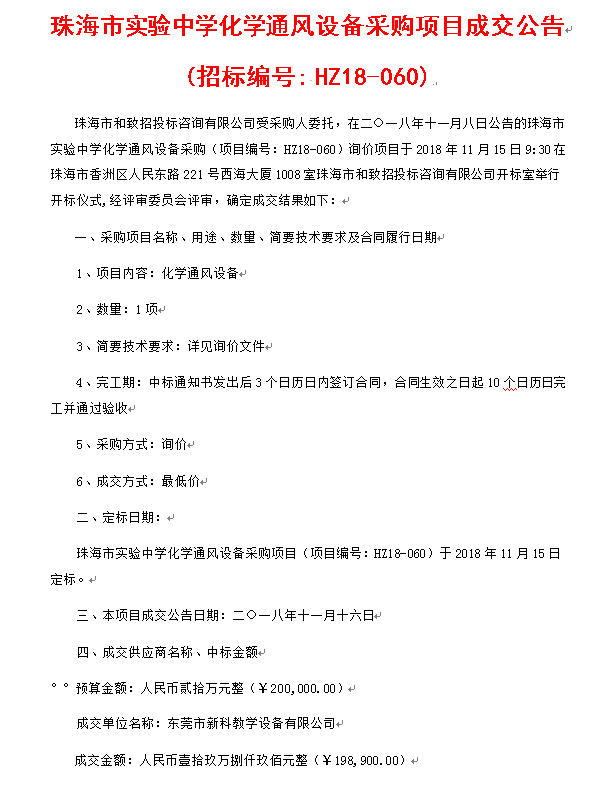 熱烈祝賀新科教學(xué)設(shè)備有限公司中標(biāo)珠海市實驗中學(xué)化學(xué)實驗室通風(fēng)系統(tǒng)升級項目